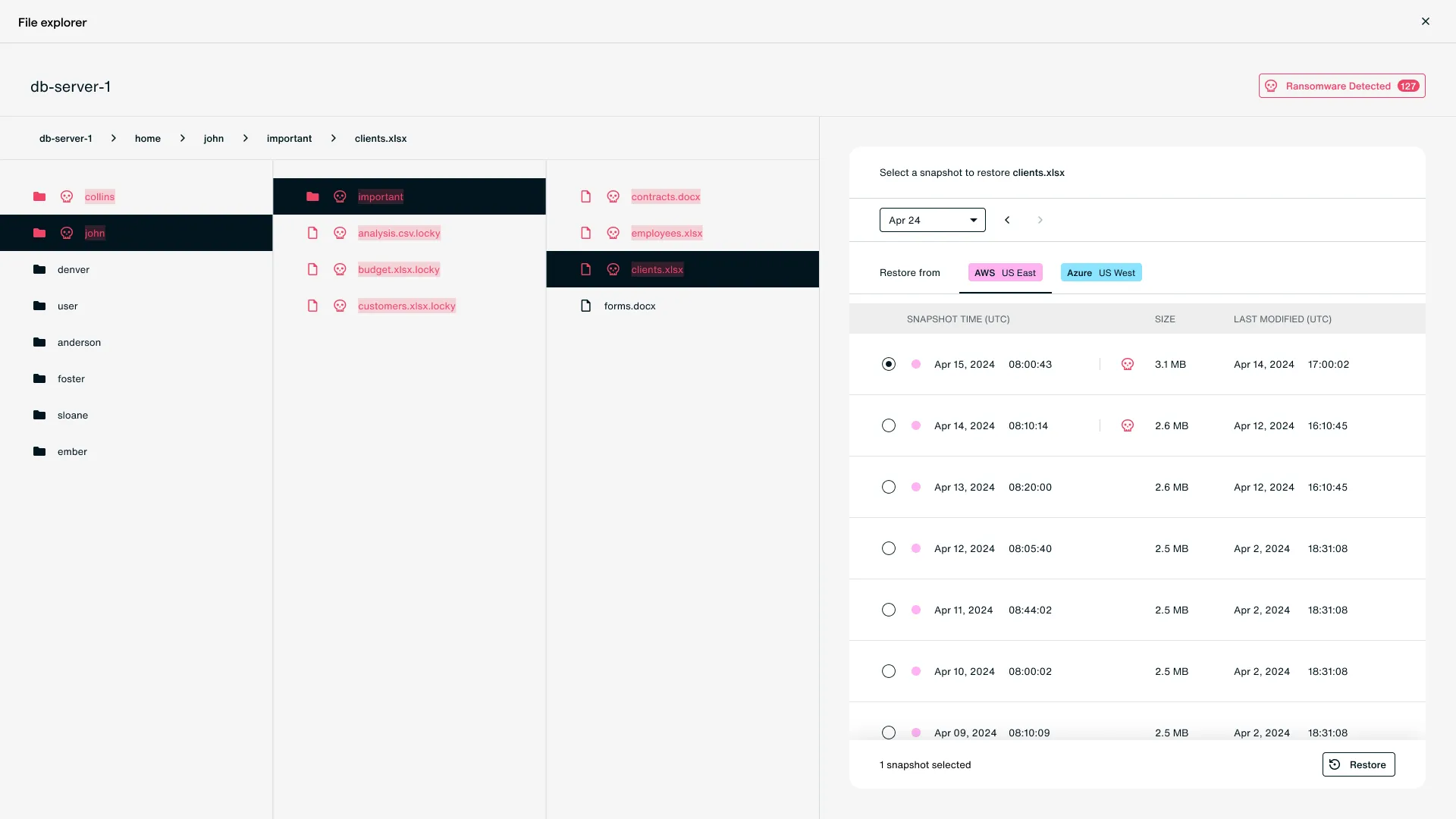 - Recover: Enables fast, targeted restore of compromised data—no need for full snapshot recovery of clean data (without the risk of bringing back compromised data).