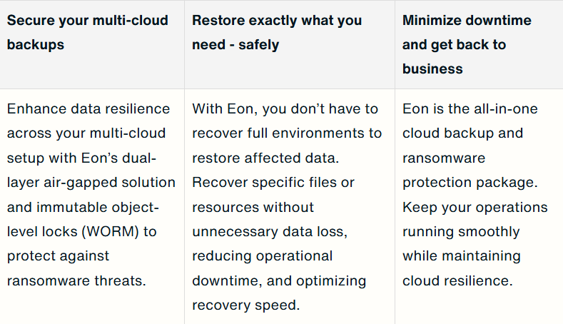 Less downtime, lower recovery costs, and no risk of putting corrupted data back into production. Request a demo today and see how Eon protects your cloud backups from ransomware.