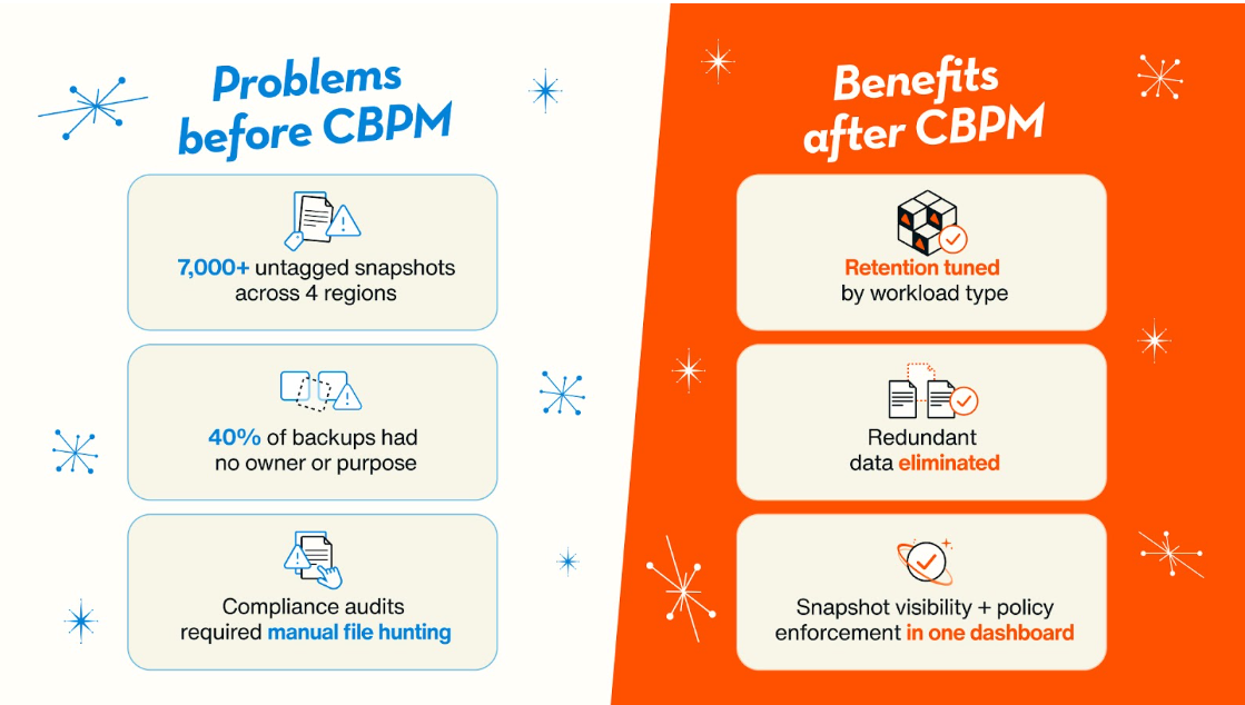 CBPM replaces guesswork with automation. It continuously monitors your environment, applies the right retention, and stops unnecessary duplicates before they ever hit your bill.