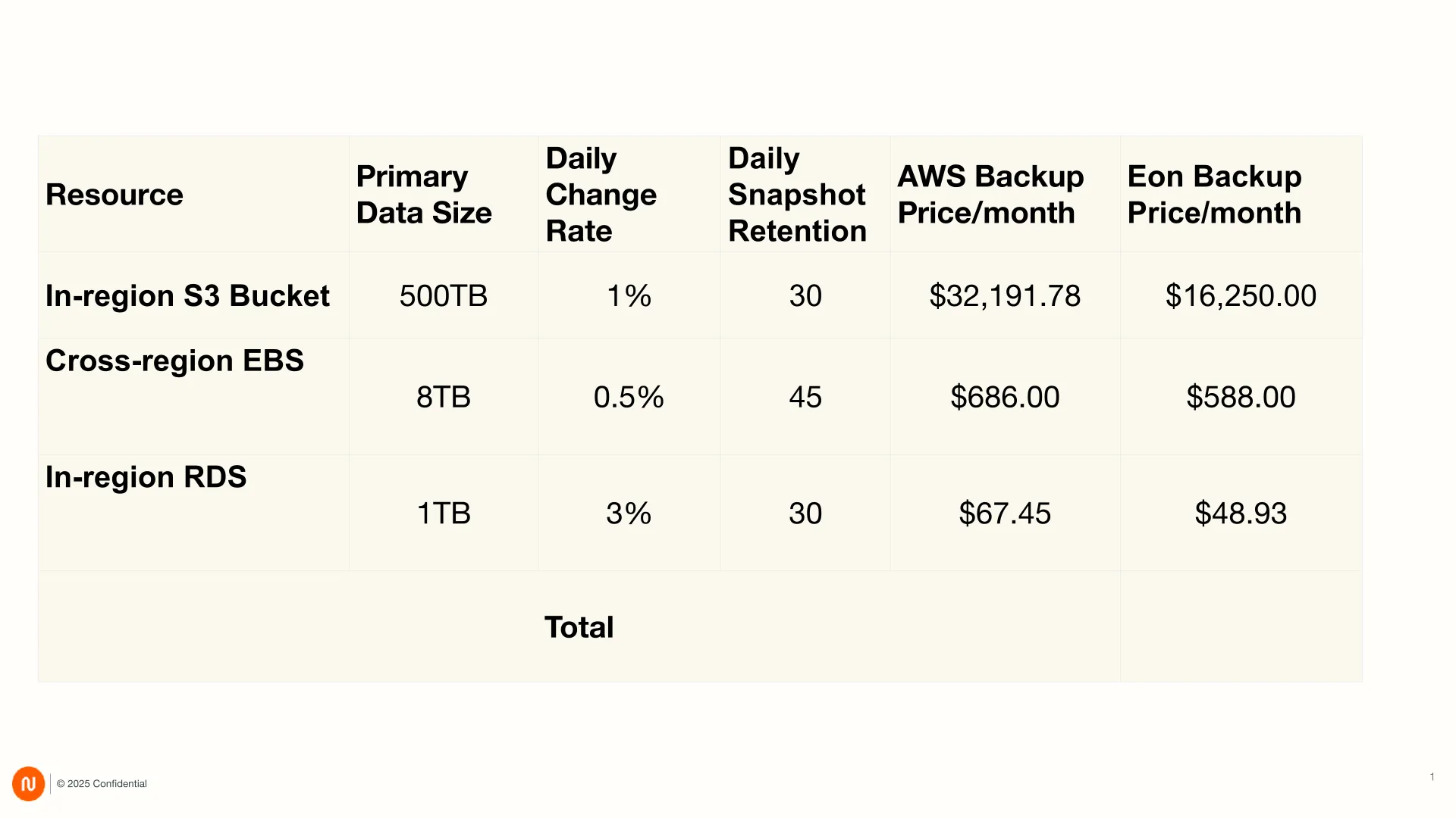 Now that we understand the factors that go into TCO analysis of a data protection solution, let’s take a look at a comparison of cloud consumption cost of AWS Backup versus Eon: