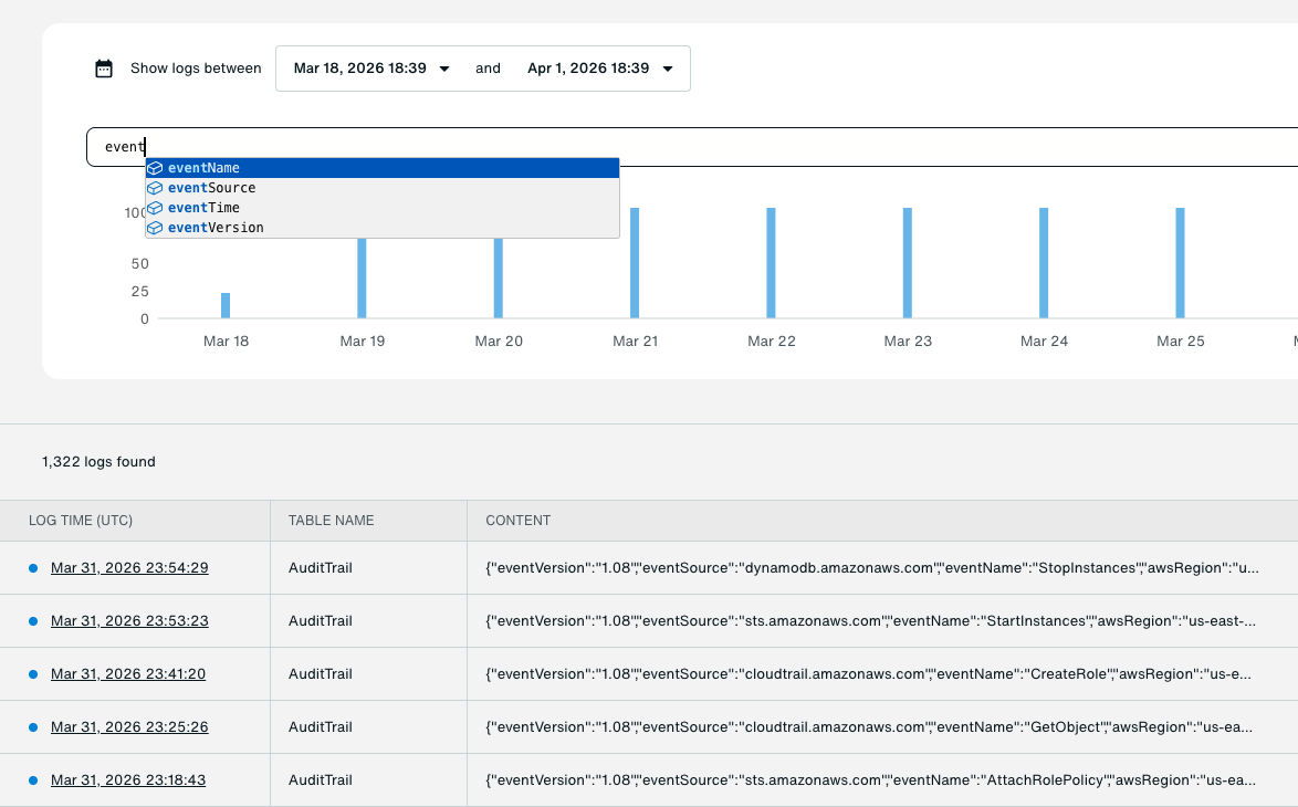 Search across datasets automatically discovered from S3 backups to identify usage shifts, anomalies, and operational patterns over time.